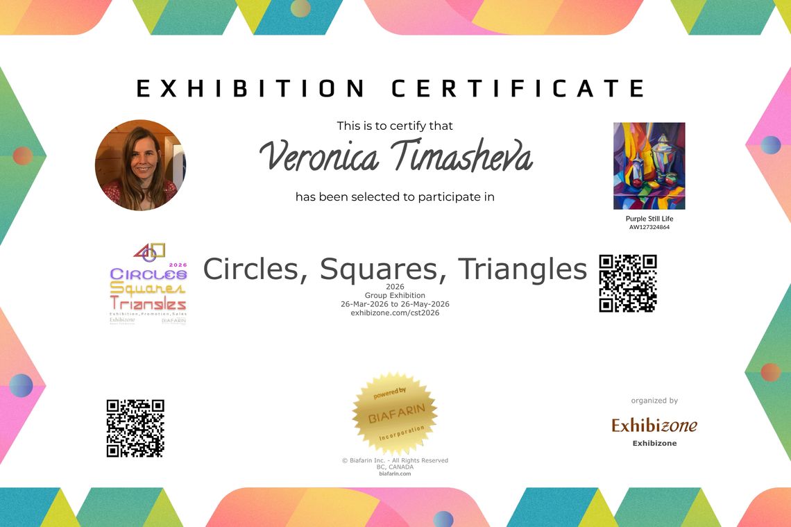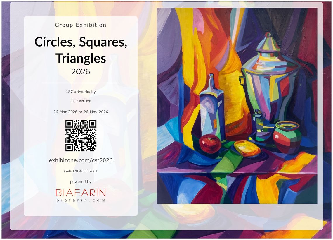 My acrylic painting Purple Still Life has been selected for Circles, Squares, Triangles 2026 (March 26 – May 26, 2026), organized by Exhibizone and powered by Biafarin, and is featured on ARTSY.net.