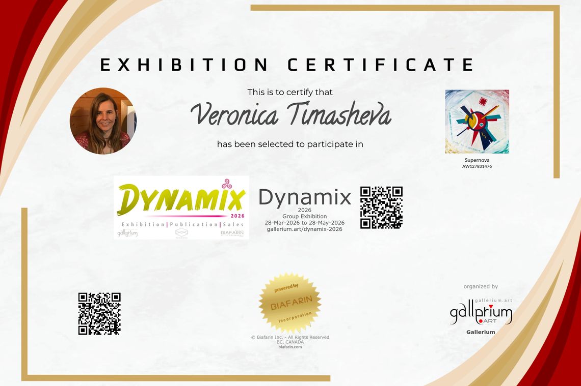 My Supernova abstract acrylic painting (Cosmic Suprematism series) has been selected for Dynamix 2026 exhibition (March 28 – May 28, 2026), organized by Gallerium on Biafarin platform, and is featured on ARTSY.net.