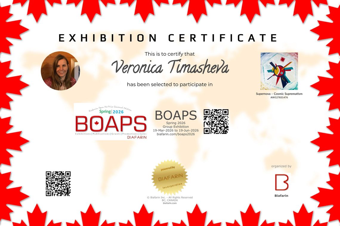My abstract acrylic painting Supernova – Cosmic Suprematism has been selected for BOAPS – Spring 2026 exhibition (March 19 – June 19, 2026), organized by Biafarin, and is featured on ARTSY.net.